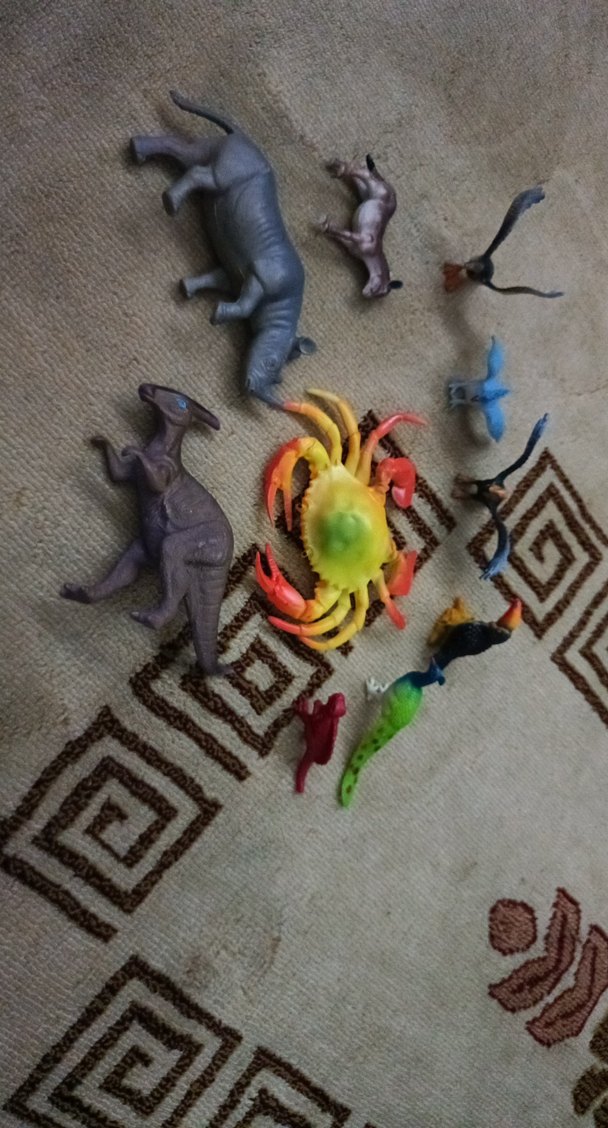 Çeşitli renklerde ve koyu tonlarda hayvan ve dinozor figürleri, aralarında yengeç ve gergedan da bulunuyor. toplu fiyat