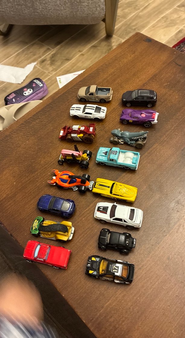 Farklı modellerde ve canlı koyu renklerde çeşitli küçük oyuncak arabalar. Hot wels