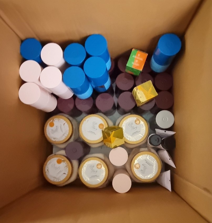 Çeşitli renklerde krem ve sprey makyaj ürünleri içeren set, kutu içinde düzenlenmiş.