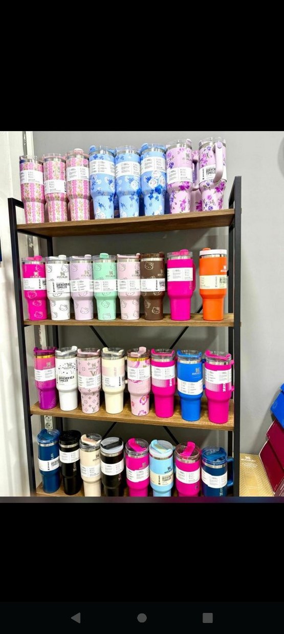 Pembe, mavi ve turuncu gibi canlı ve açık renk seçenekleri bulunan, kapaklı ve saplı termos bardaklar raflarda sergileniyor. ☕