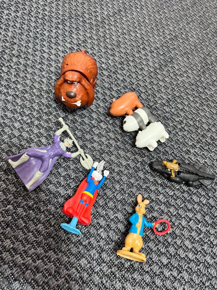 Koyu ve canlı renklerde ayı, köpek ve çeşitli çizgi film karakterlerinden oluşan renkli aksiyon figürleri seti.