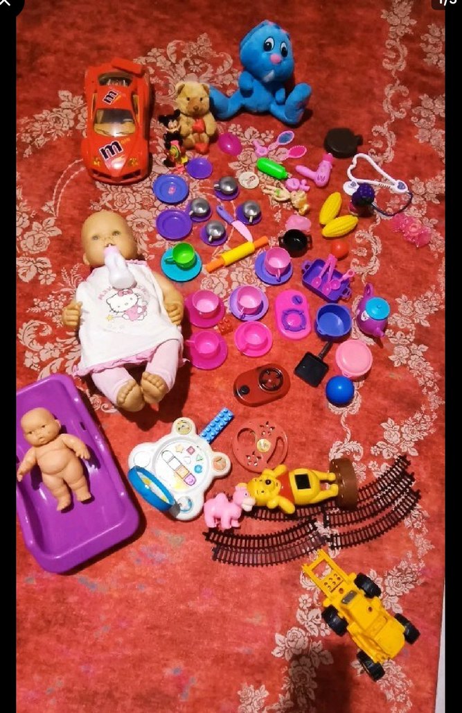 Bebekler, oyuncak arabalar, çay seti parçaları, hayvan figürleri ve oyun aksesuarlarından oluşan renkli bir çocuk oyuncakları koleksiyonu.