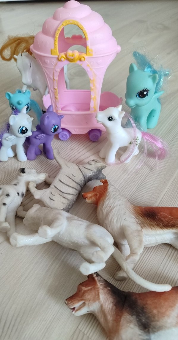 Canlı renklerde, çeşitli hayvan ve at figürlerinden oluşan çok renkli bir set.