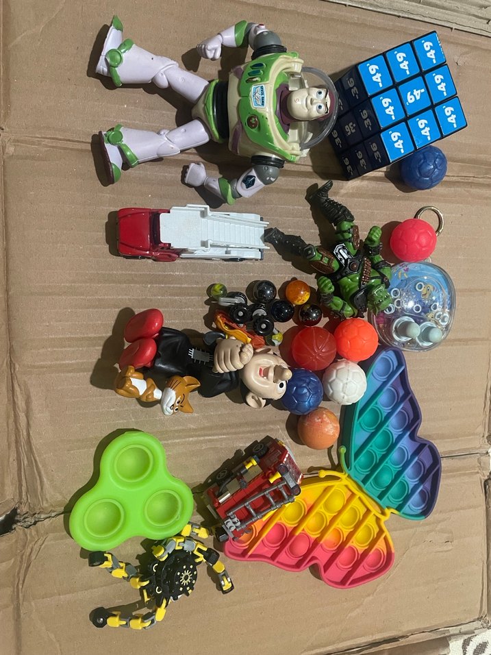 Bu set, Buzz Lightyear figürü, itfaiye arabası, Rubik küpü, pop-it oyuncaklar ve küçük figürler gibi çeşitli renkli oyuncakları içerir. Çizikleri vardır