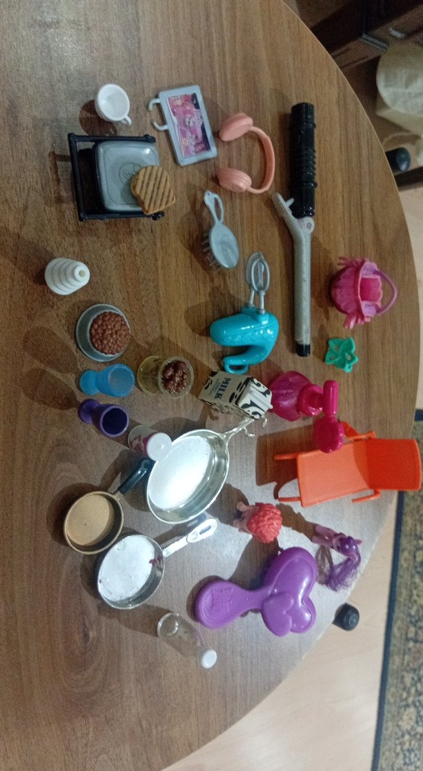 Mutfağa ve saç bakımına yönelik çeşitli oyuncak aksesuarları, açık ve canlı renklerde.
