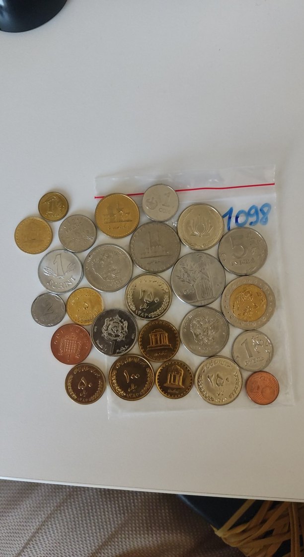 Çeşitli renklerde ve farklı boyutlarda paralar, beyaz zeminde '1098' numaralı plastik poşette sergileniyor.