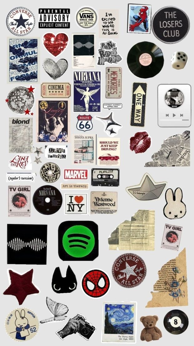 Müzik grupları, ikonlar ve vintage motifler içeren retro ve pop kültür çıkartmaları koleksiyonu.