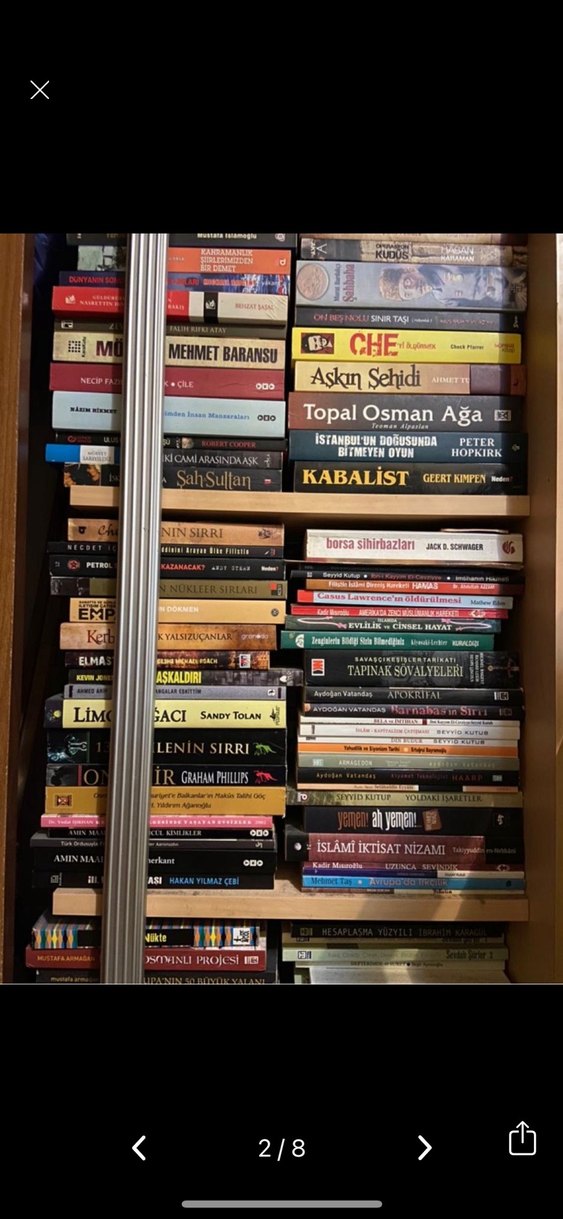 Kabalist, Enin Sirri, CHE, Topal Osman Aga ve Aşkın Şehidi gibi romanların bulunduğu kitap rafı. TANE 150