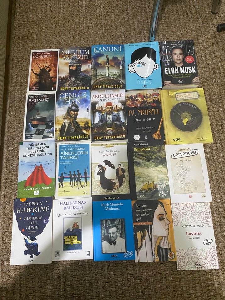 Abdülhamid, Elon Musk ve Stephen Hawking gibi tarihi ve modern kişilikleri içeren biyografilerin yanı sıra çeşitli türleri barındıran sıfır kitap koleksiyonu. yalnızca mucize kitabının kapağında ufak bi deformasyon bir de can veren pervaneler kitabının bir sayfasında altı çizili kısım bulunmaktadır. fiyat seçilecek kitaplara göre biçilecektir.