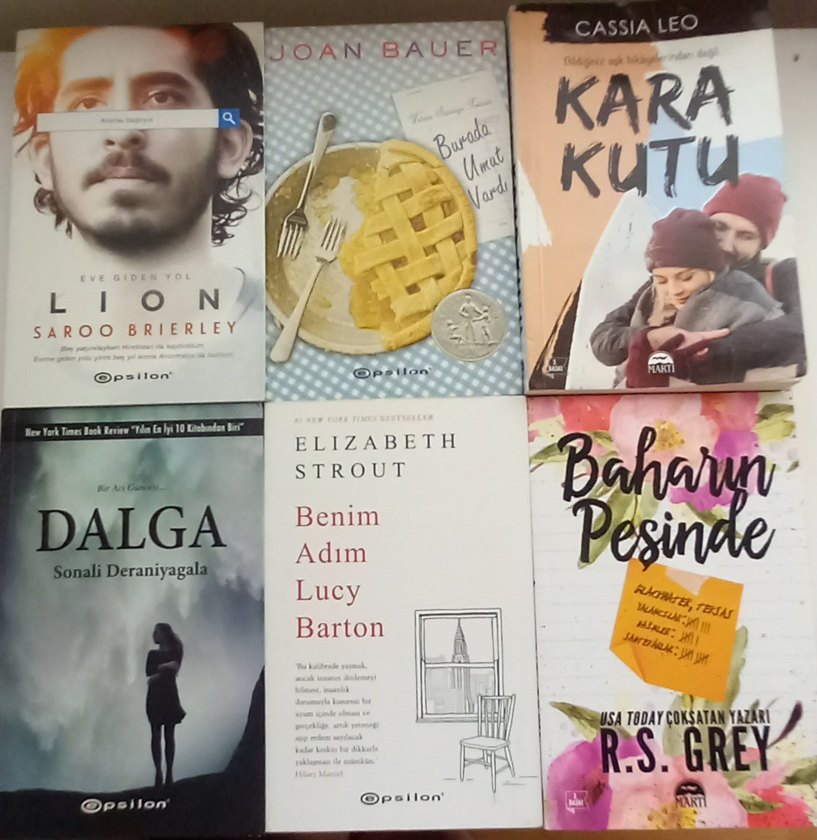 Joan Bauer-Burada umut vardı Elizabeth Strout-Benim adım lucy barton Sonali Deraniyagala-Dalga R.S. Grey-Baharın peşinde Saroo Brıerley-Lion Cassia Leo-Kara kutu deformiteli kitap görselde belirtilmiştir.