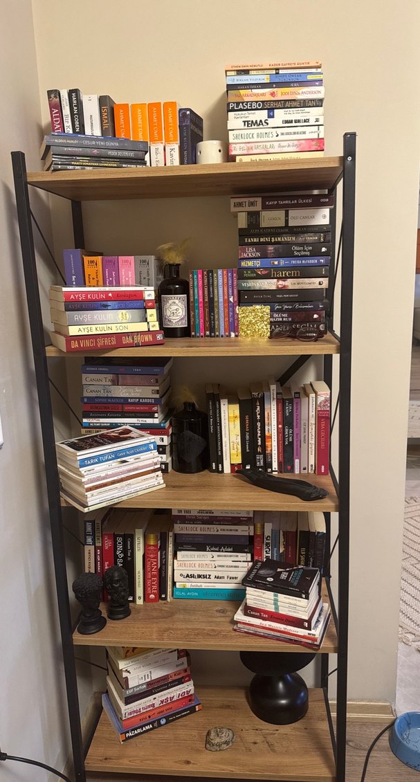 Farklı yazarların ve türlerin romanlarını içeren çeşitli kitaplarla dolu kitaplık, istediğiniz urunun tekli veya çoklu fiyatini sorunuz