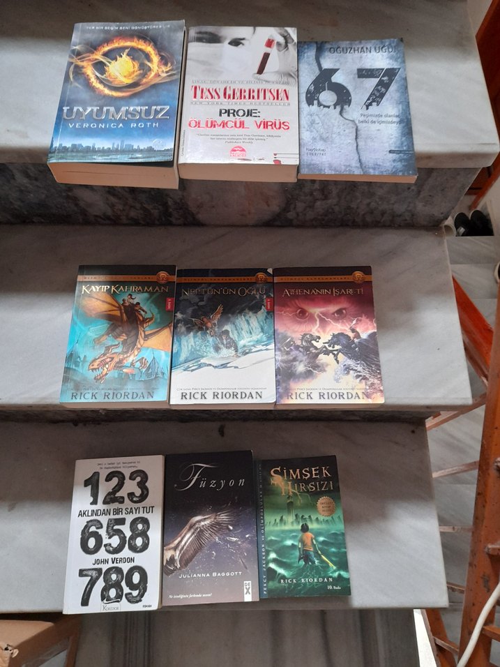"Uyumsuz," "Proje: Ölümcül Virüs" ve Rick Riordan'ın eserlerinin bulunduğu çeşitli romanlar koleksiyonu.
