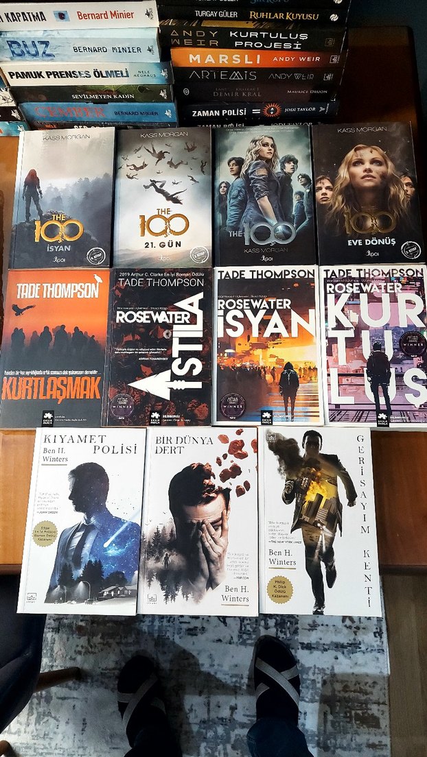 "Rosewater" ve "Kurtuluş" gibi Tade Thompson kitapları, "The 100" serisi SATILDI.. ve Ben H. Winters eserlerini içeren çeşitli romanlar seti.