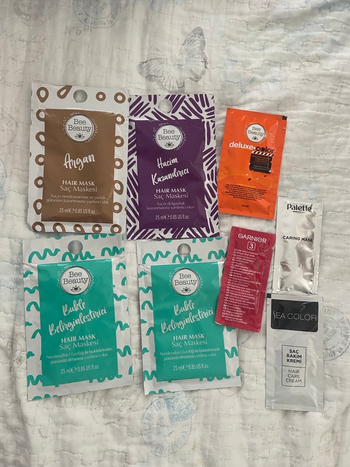 Bee Beauty argan ve keratin saç maskeleri, deluxe color, Garnier ve Palette saç bakım kremleri içeren bakım seti.
