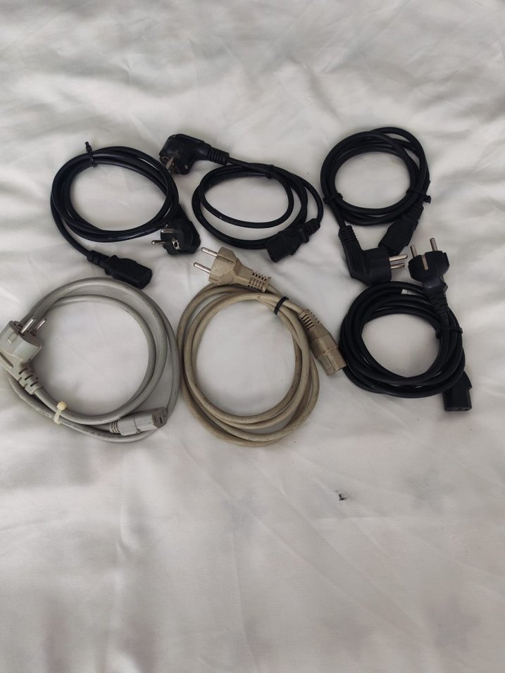 Farklı fiş tiplerine sahip çeşitli siyah ve gri güç kabloları seti. ⚡
