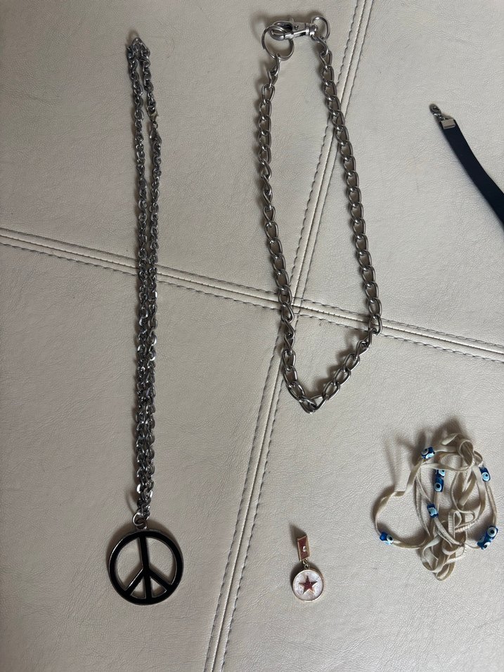 Uzun zincir detaylı gri kadın kolye, barış sembolü figürlü. Bohem ve grunge punk tarzlara uygun, günlük kullanıma ideal. ✌️