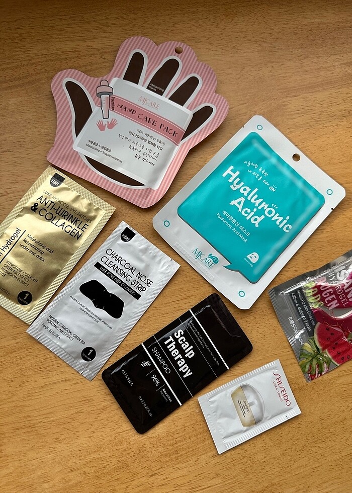 MjCare El maskesi, MjCare Hyaluronic Asit Yüz Maskesi, Isana Karpuzlu Göz Altı Maskesi, Missha Scalp Terapy Şampuan Testerı, Kore Markası HBH Göz Altı ve Burun Maskesi ile birkaç denemelik, tek kullanımlık ürünü topluca göndereceğim.