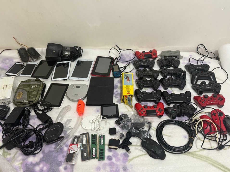 Tabletler, siyah ve kırmızı oyun kontrolörleri, bellek modülleri ve diğer elektronik aksesuarlar dahil çeşitli teknoloji ürünleri sergileniyor. Fİyat sorunuz …..