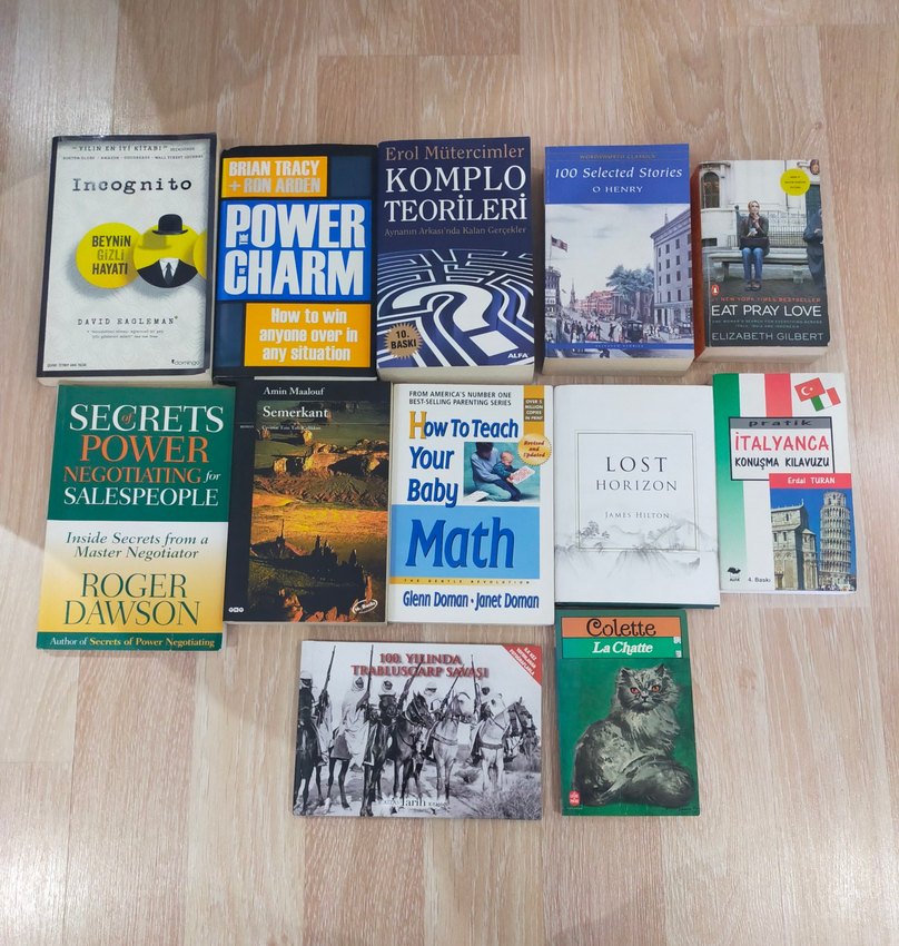 Pazarlık, güç, dil öğrenimi, psikoloji, hikaye anlatımı ve seyahat konularında Daniel Kahneman ve Elizabeth Gilbert gibi yazarların kitaplarını içeren set. TANESİ 150 TL
