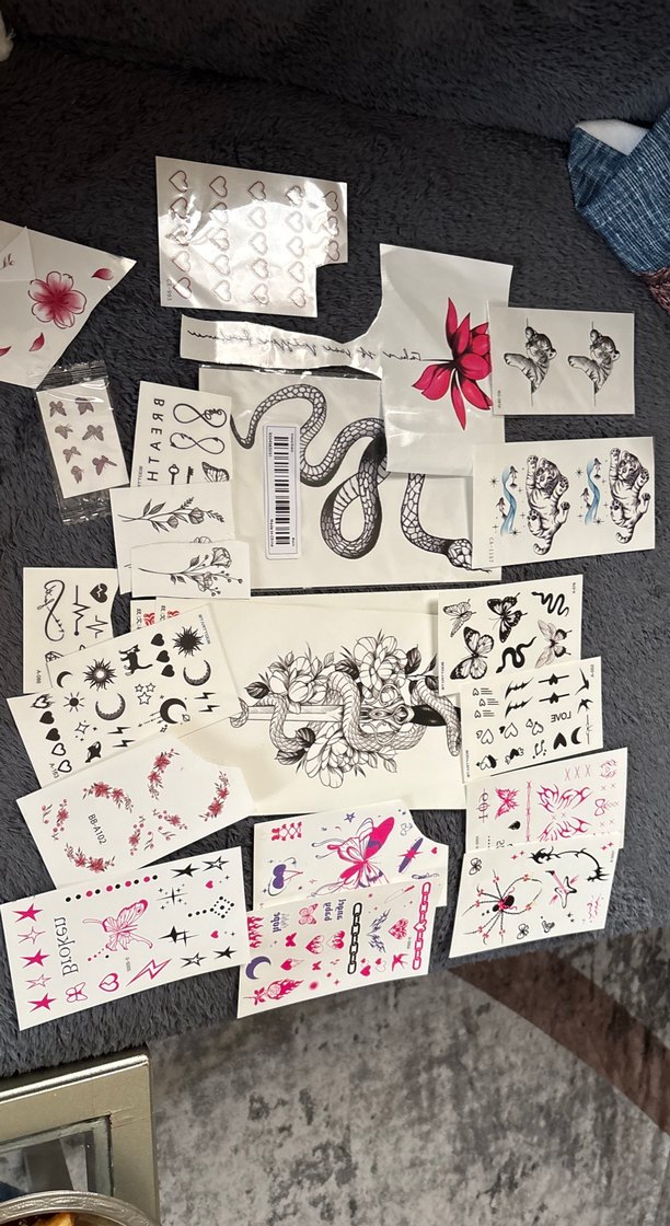 Çiçek, kalp, yılan ve gökyüzü ve başka desenleri içeren vücut ve parmak dövmeleri geçicidir suyla temas olmazsa bi haftaya kadar durur içlerinden bi kaç tanesi denemelik kullanıldı bunlar kalanlar hepsi birlikte verilicek