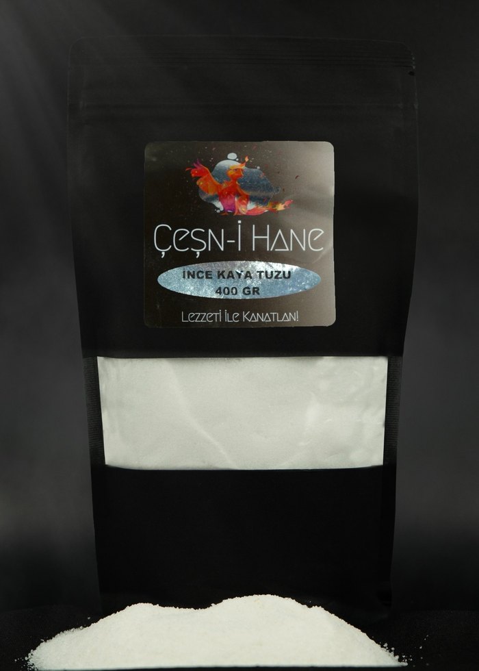 Çeşn-i Hane ince kaya tuzu, 400 gramlık pakette. Baharat olarak kullanılan ince, beyaz toz.