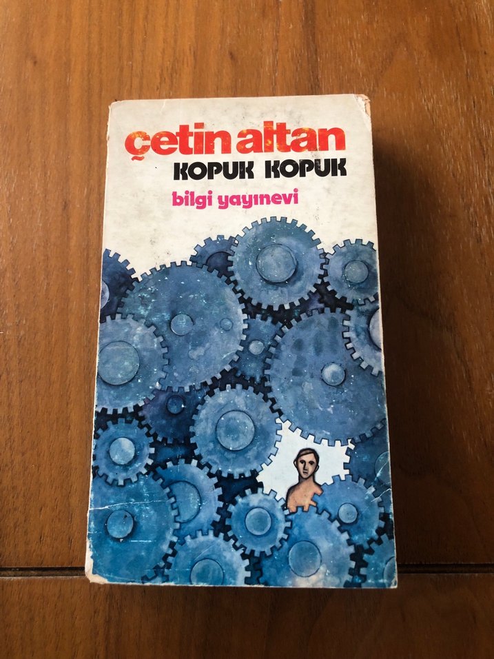 Bilgi Yayınevi tarafından yayımlanan Çetin Altan'ın 'Kopuk Kopuk' kitabı, kapağında mavi dişliler ve küçük bir insan figürü bulunur.