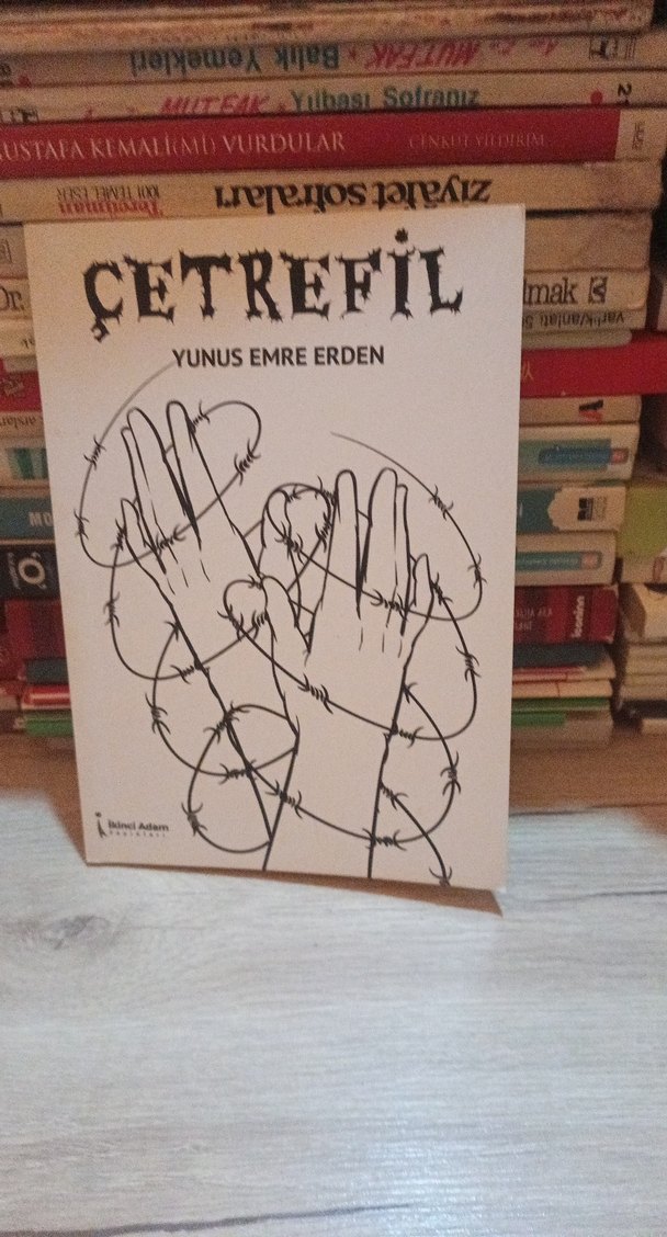 Yunus Emre Erden'in "Çetrefil" adlı romanı, dikenli tellerle sarılmış ellerin çizimiyle zorluk ve karmaşıklığı simgeliyor.