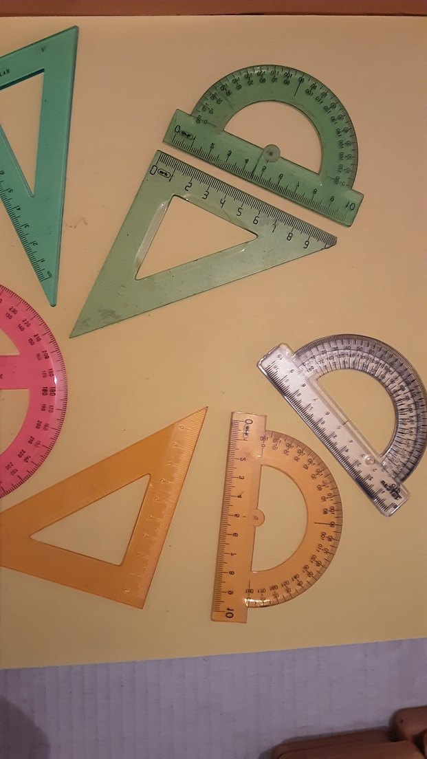 Renkli plastikten yapılmış, okunması kolay işaretlere sahip, okul etkinlikleri için geometrik cetvel ve gönye seti. Ölçümler için uygundur.