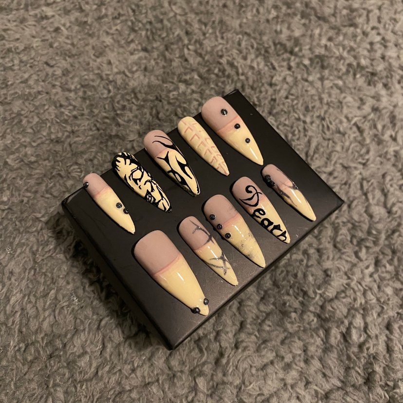 Siyah ve bej tonlarında, sanatsal desenler ve küçük siyah taşlarla süslenmiş dekoratif tırnak seti. Ürünümüz 10’lu set halinde, tırnak ölçülerinize ve istediğiniz forma özel olarak hazırlanmaktadır Kişiye özel tasarım talepleriniz ve ölçü alımı için görsellerin sonundaki bilgilendirme fotoğrafını inceleyebilir, bizimle iletişime geçebilirsiniz.