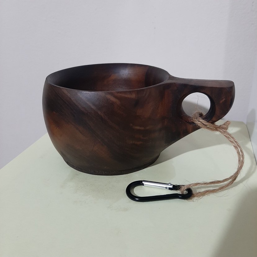 Koyu kahverengi ahşaptan yapılmış, kulplu ve karabina takmak için delikli, taşınabilir kupa. ☕