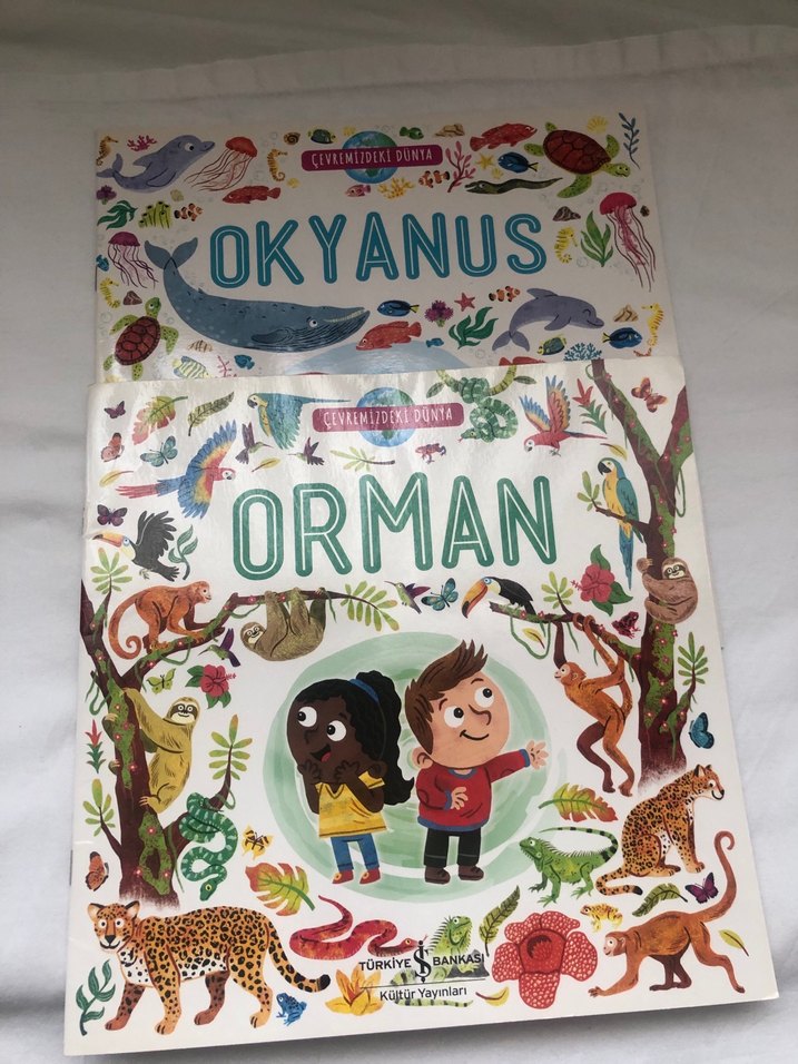 Türkiye İş Bankası yayınlarından, hayvanlar ve doğa temalı renkli çizimlerle 'Orman' ve 'Okyanus' adlı iki çocuk kitabı.
