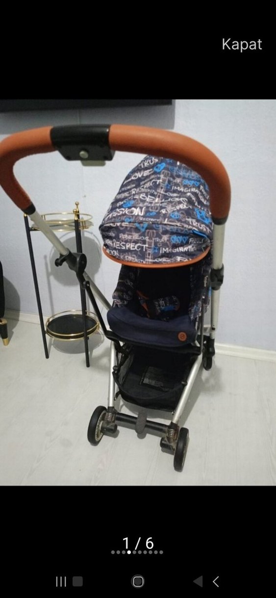 ceybek marka bebek arabası Mavi renkli bebek arabası, koyu renkli ve desenli tenteye sahip. Kahverengi tutma yeri kaplaması ve dört tekerleği bulunur.