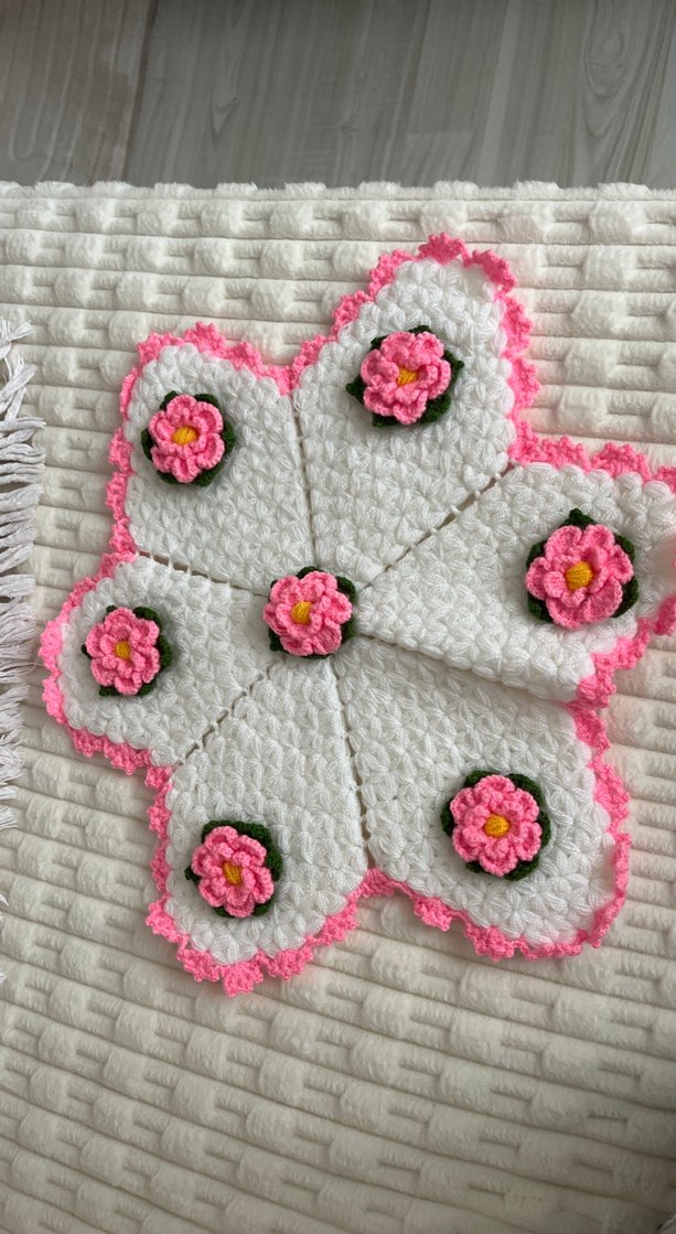 Beyaz örgü dokulu, pembe işlemeli çiçekler ve pembe kenarlığı olan çocuk battaniyesi.