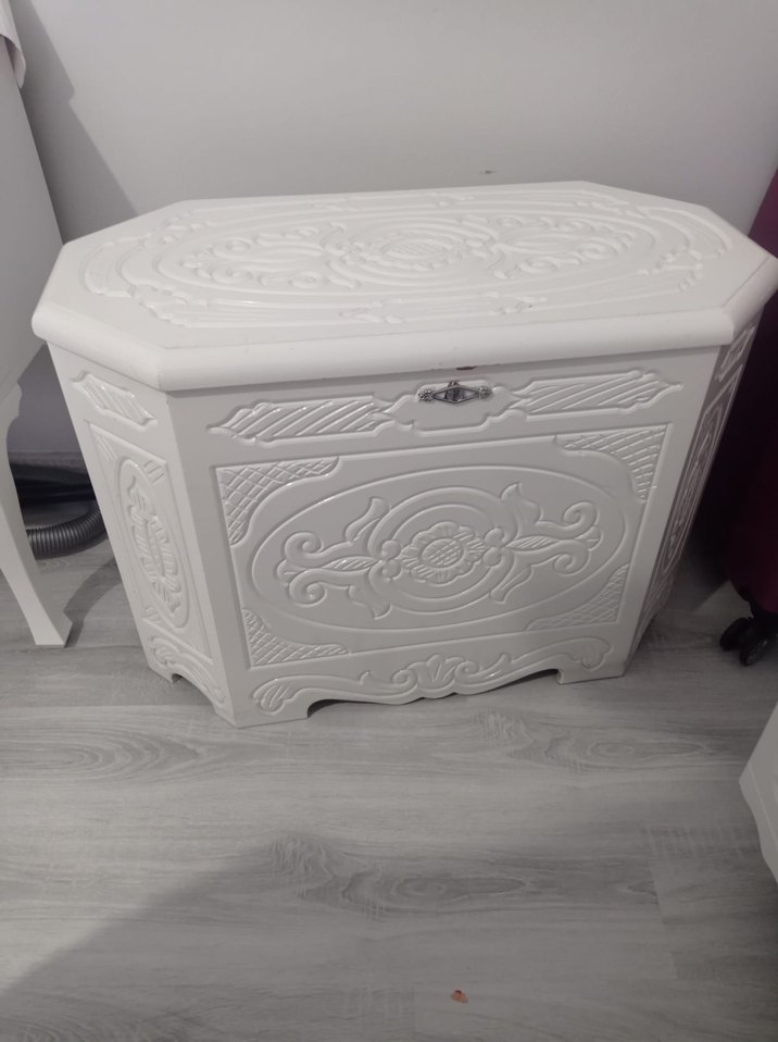 Oyma detaylı, beyaz çeyiz sandigi