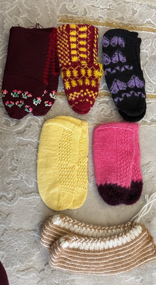 Yumuşak iplikle örülmüş, çeşitli geleneksel desenlere sahip renkli el örgüsü patikler.