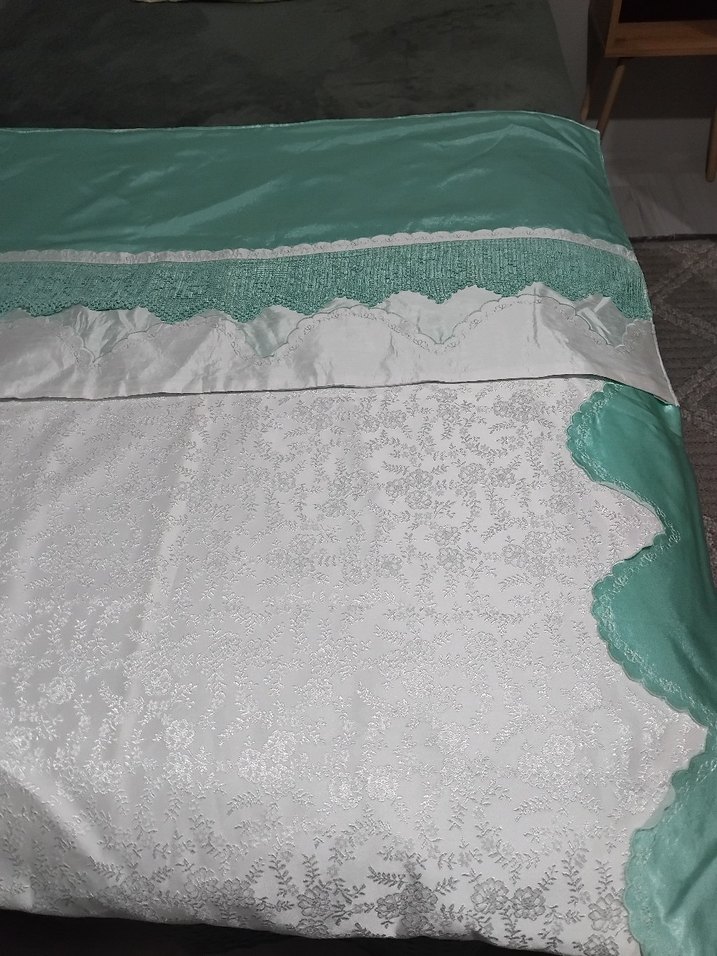 Ceyiz için yapilmisti kullanilmadi.beyaz yeşil satenden yapilmisti çok şık kaliteli bir ürün. yastık tek dantel yetmediği için. ölçüler pike en 240 cm boy 225 cm çarşaf 194-228 cm yastık 74-48 cmdir lütfen sorunuz iade kabul etmiyorum