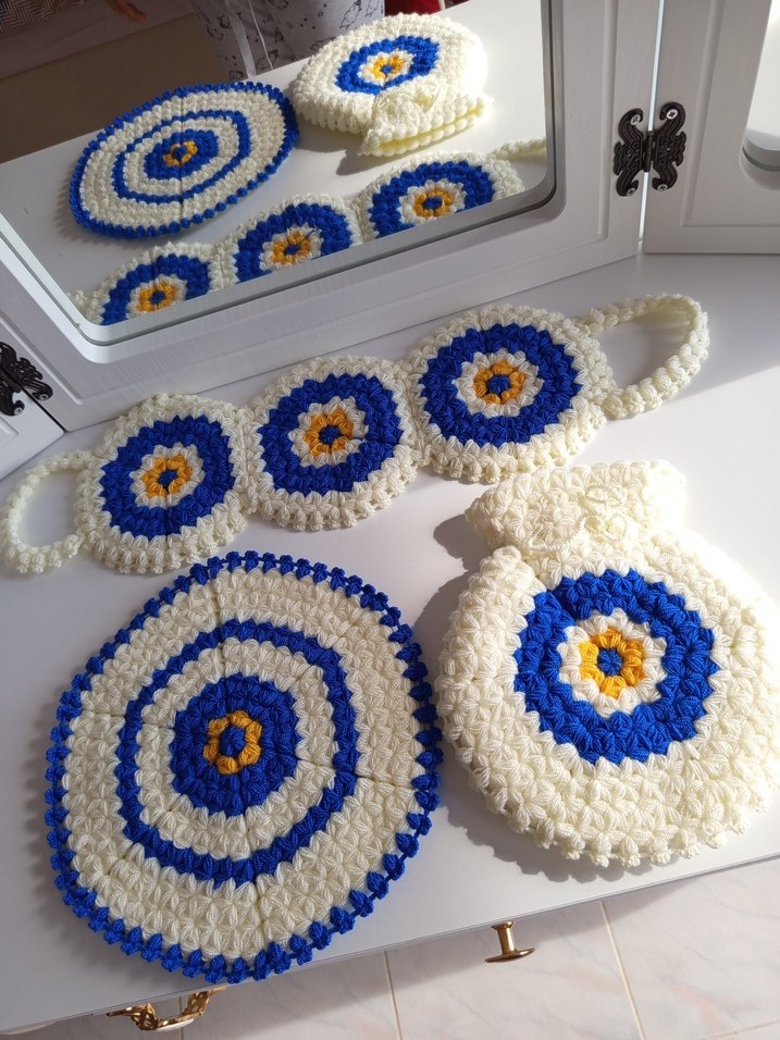 Mavi, beyaz ve sarı renklerde dairesel desenli renkli örgü banyo lifi ceyizlik hemen kargo hazır ürün