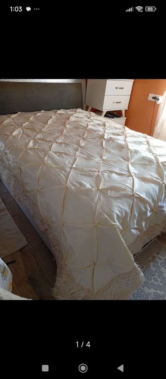 Parlak beyaz renkte, dokulu ve toplu desenli yatak örtüsü. Kenarlarında yumuşak püskül detayları bulunur. ️