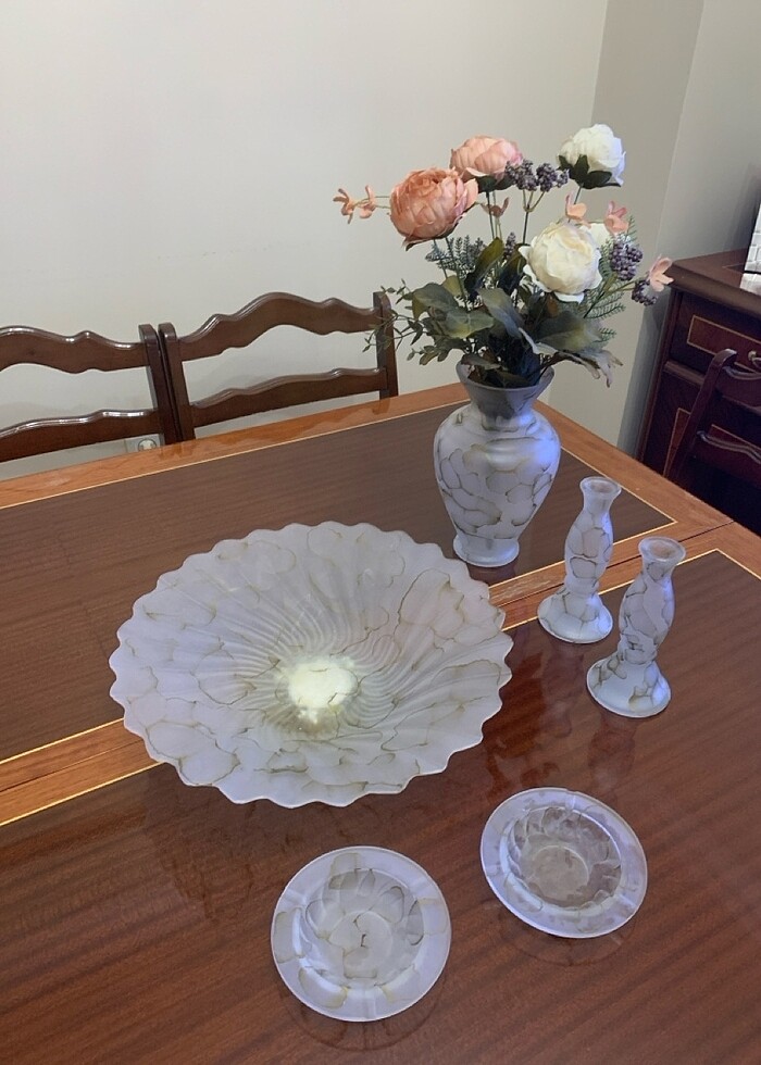 Ikı kulluk ıkı mumluk bır vazo bır de buyuk şekerlik tam takım toplam altı parca çeyizlik set renkli krem gold