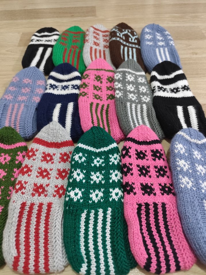 Nakışlı desenlere sahip renkli örgü kız sıcak ev terlikleri, bohem, hippie ve retro tarzlara uygun.