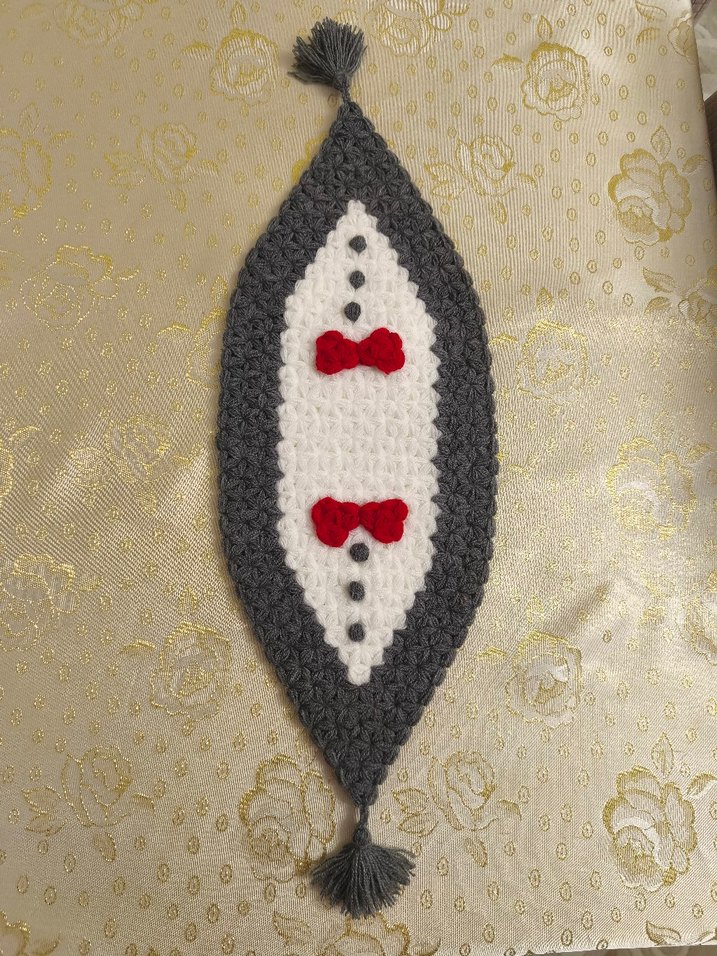 şık çeyizlik banyo lifi, gri ve beyaz zemin üzerinde iki küçük kırmızı nakışlı papyon detayıyla klasik bir tasarıma sahip.