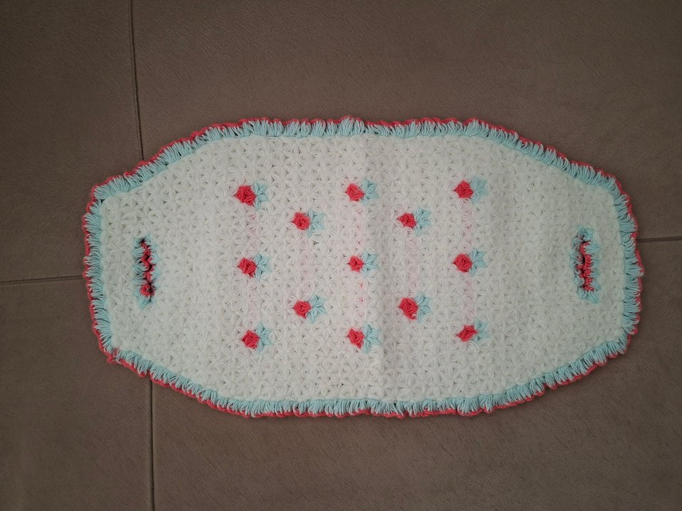 el emeği örgü çiçek motifli banyo lifi, çift tutma yerli, kırmızı turkuaz ve beyaz renklerden oluşmakta, çeyizlik