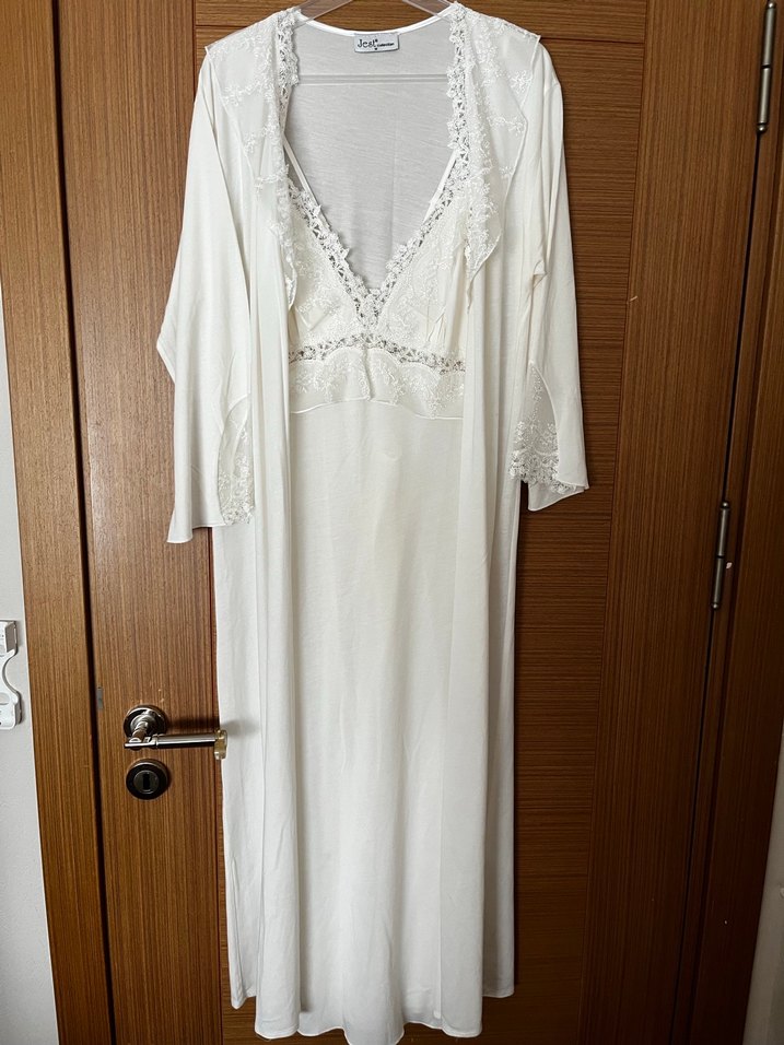 İçinde 1 gecelik, 1 sabahlık, 1 pijama takımı ve 1 babydoll var. Pamuklu, incecik , yumuşacık, tiril tiril bir kumaşı var. Hiç kullanılmadı. Geceliğin tek tarafında derin bir yırtmaç var. Pijama altının arka beli lastikli. Diğerleri hiç giyilmedi. Gecelik göğüs:40 boy:114 Pijama bel:34,5 boy:101 Pijama göğüs:48 bel:42 Babydoll bel:23 boy:30 Babydoll göğüs:41