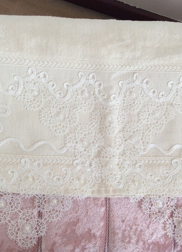 Çeyizlik yüz havlusu, elişi dantel bordürlü krem renk