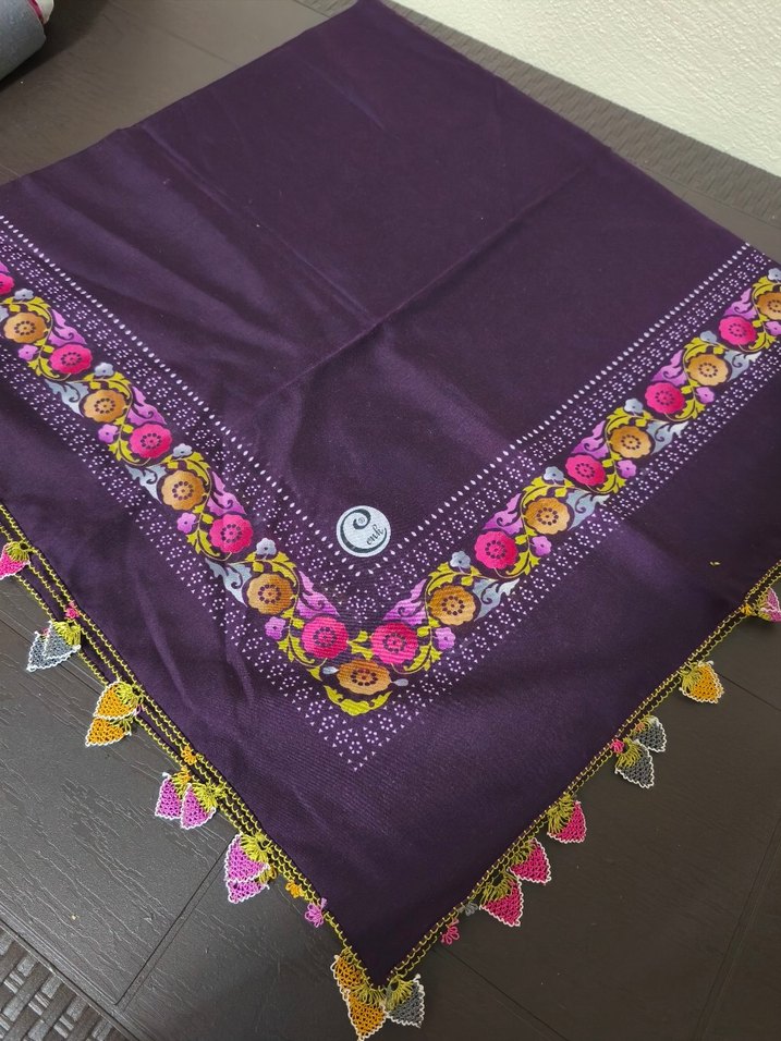 Dantel detaylı, canlı çiçek işlemeli koyu mor kadın fular, bohem tarz için uygun.