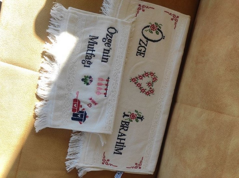 Nakışlı çiçek ve kalp desenli beyaz mutfak havluları, kişiye özel isimlerle. Yumuşak ve hafif kumaş, püsküllü kenarlar. Fiesta markadır. 2'li havlu seti. FİYAT İÇİN MESAJ ATINIZ