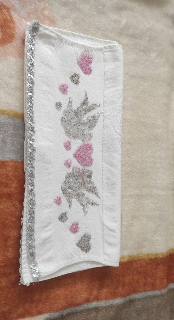 Nakışlı kalp ve kuğu desenli beyaz havlu, gümüş renkli süslemeye sahip. Yumuşak ve hafif dokulu kumaştan üretilmiştir.