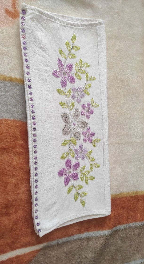 Yumuşak beyaz kumaş üzerinde açık renkli çok renkli çiçek nakışları bulunan geleneksel tarzda havlu. Kenarları süslüdür.