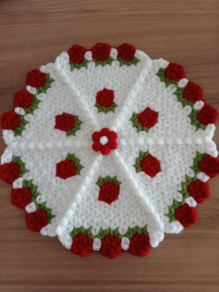 Yuvarlak, renkli çiçek desenli, beyaz zemin üzerinde kırmızı ve yeşil renklerde örgü masa örtüsü.