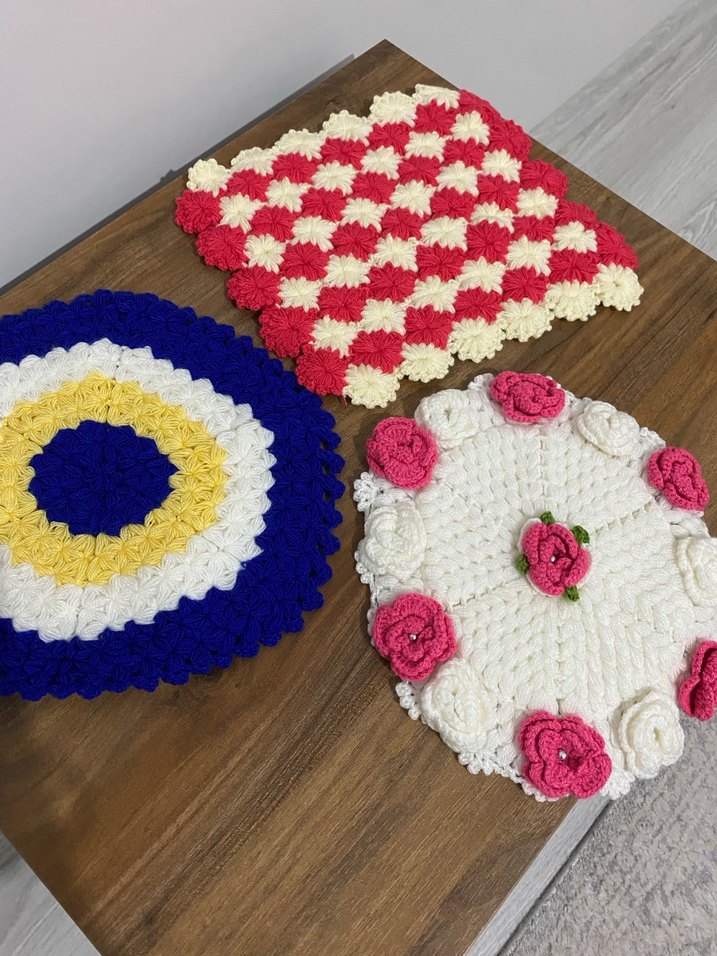 Yumuşak dokulu iplikten yapılmış, farklı desen ve şekillerde renkli el örgüsü banyo süngerleri.